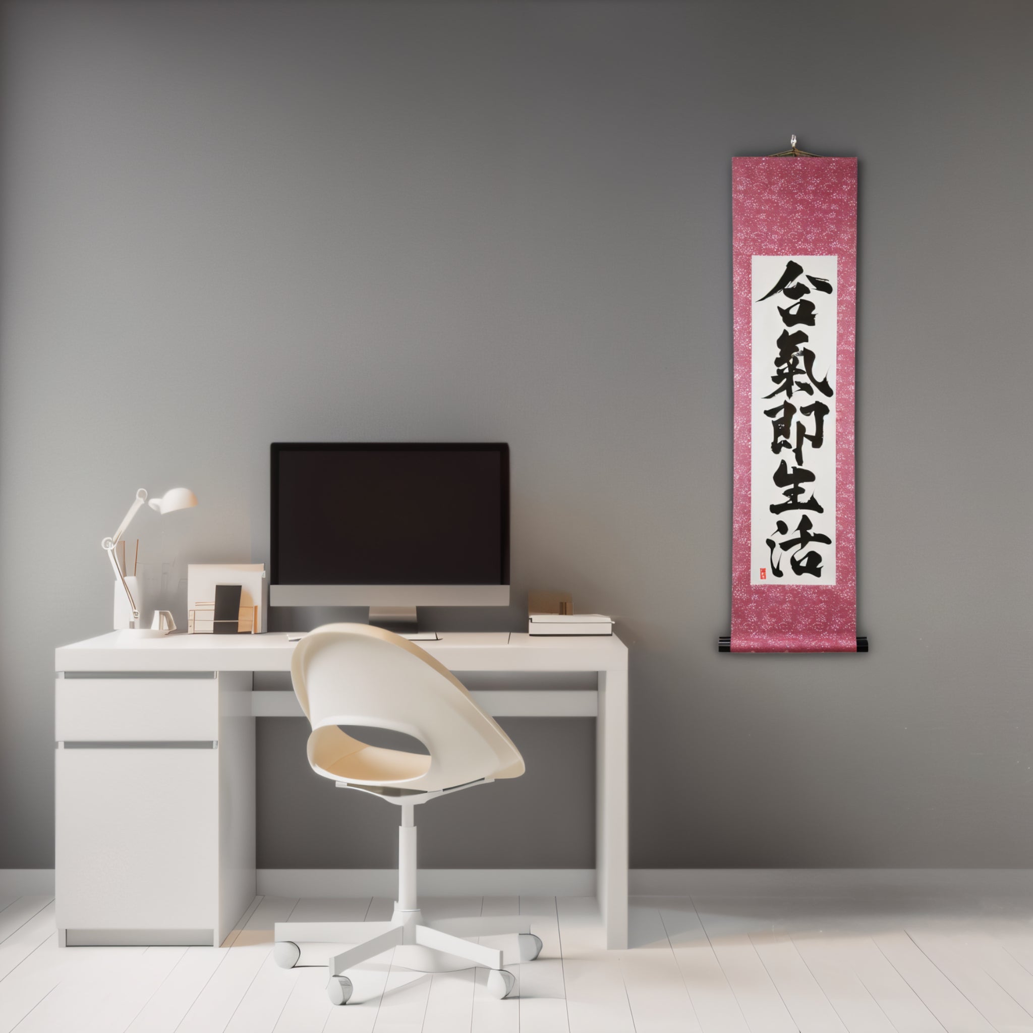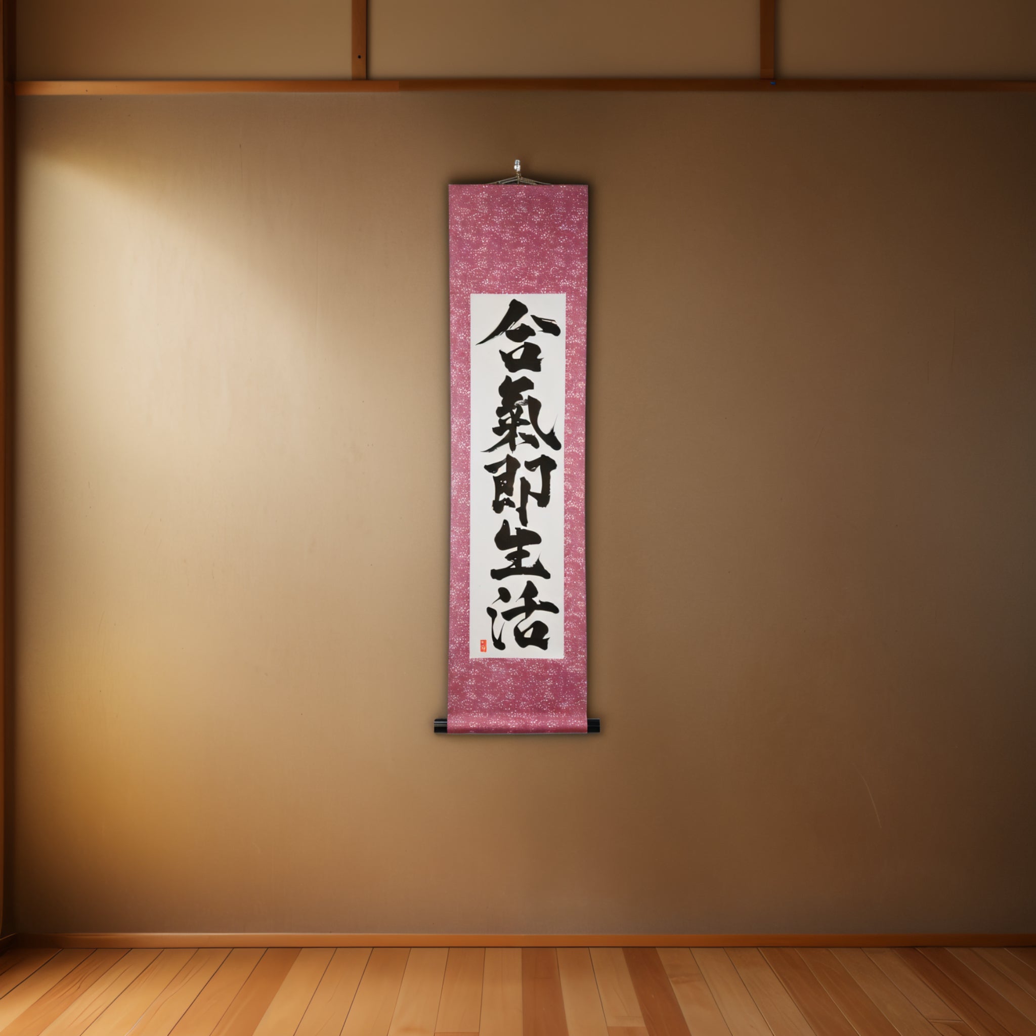 This Japanese calligraphy scroll features the profound phrase 合気即生活 (Aiki Soku Seikatsu) — "Aikido is daily life". It expresses a core principle of Aikido: the art is not confined to the dojo, but flows through every moment of our lives.