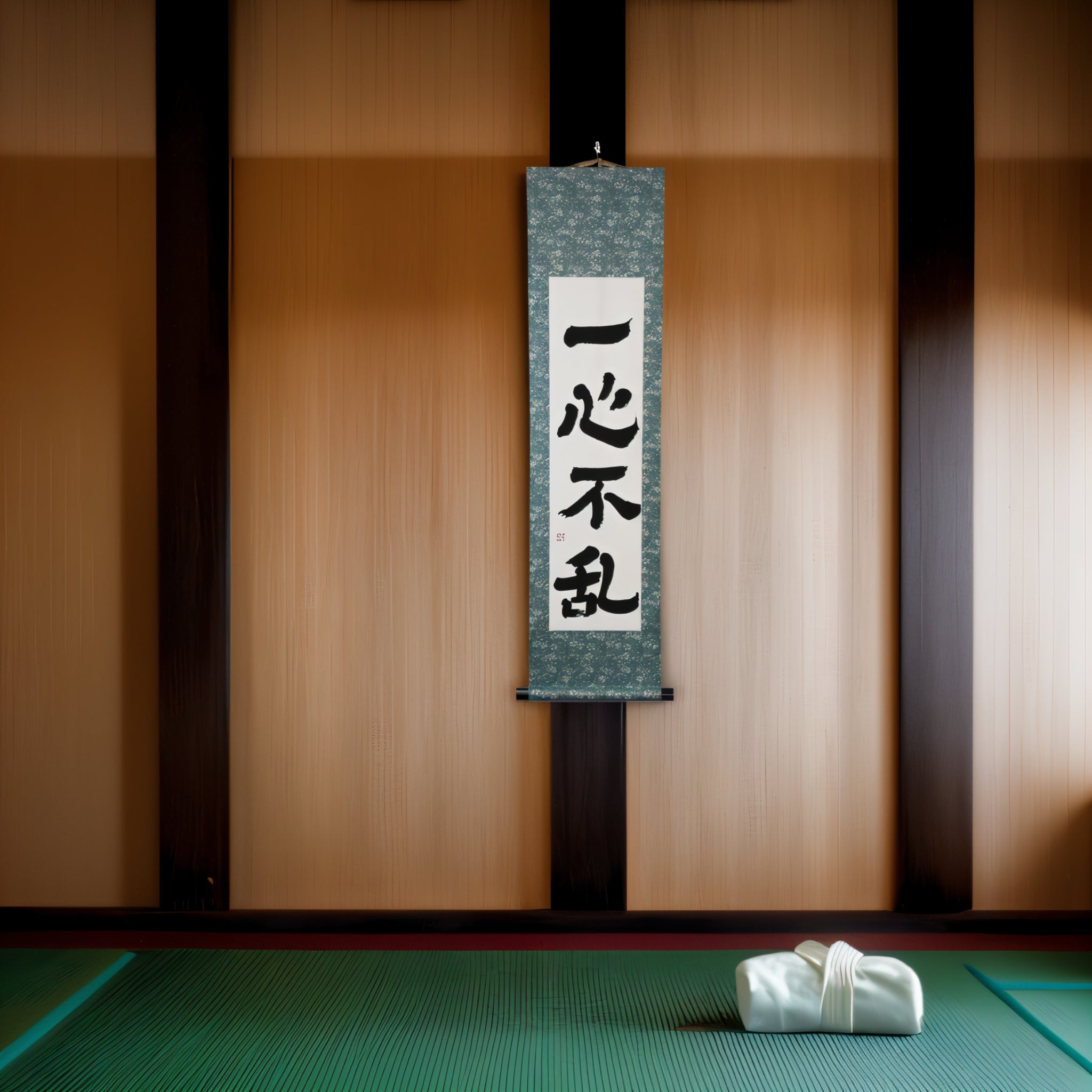 This Japanese calligraphy scroll showcases the powerful phrase 一心不乱 (Isshin Furan), meaning “undivided focus” or “with single-minded devotion”. It captures the essential mindset of martial arts — the ability to eliminate distractions and commit wholly to the moment.
