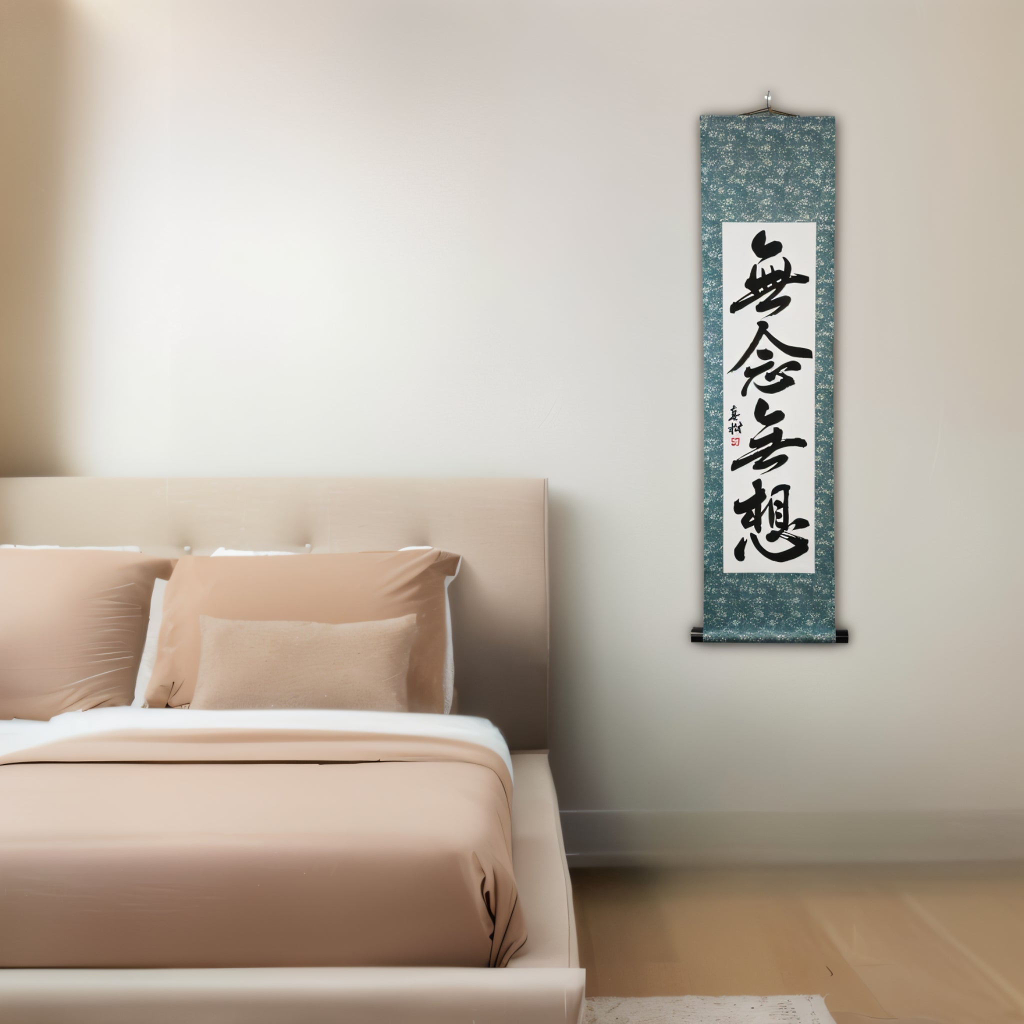 This Japanese calligraphy scroll presents the profound 禅 (Zen) principle 無念無想 (Munen Musō) — a state of mind free from thought and distraction, fundamental to the Samurai’s way. Rooted in both 禅 (Zen) practice and 武士道 (Bushidō), 無念無想 allows the warrior to act with pure presence, responding intuitively and decisively in every moment.