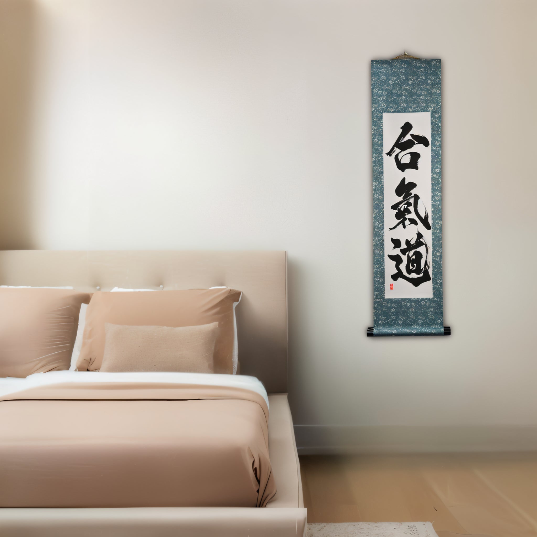 Este pergamino de caligrafía muestra con orgullo los tres caracteres de 合気道 (Aikido), que representan no solo el arte marcial, sino el compromiso y el camino que recorres en tu entrenamiento. No es solo una decoración, sino un símbolo de tu viaje, disciplina y el espíritu del Aikido.