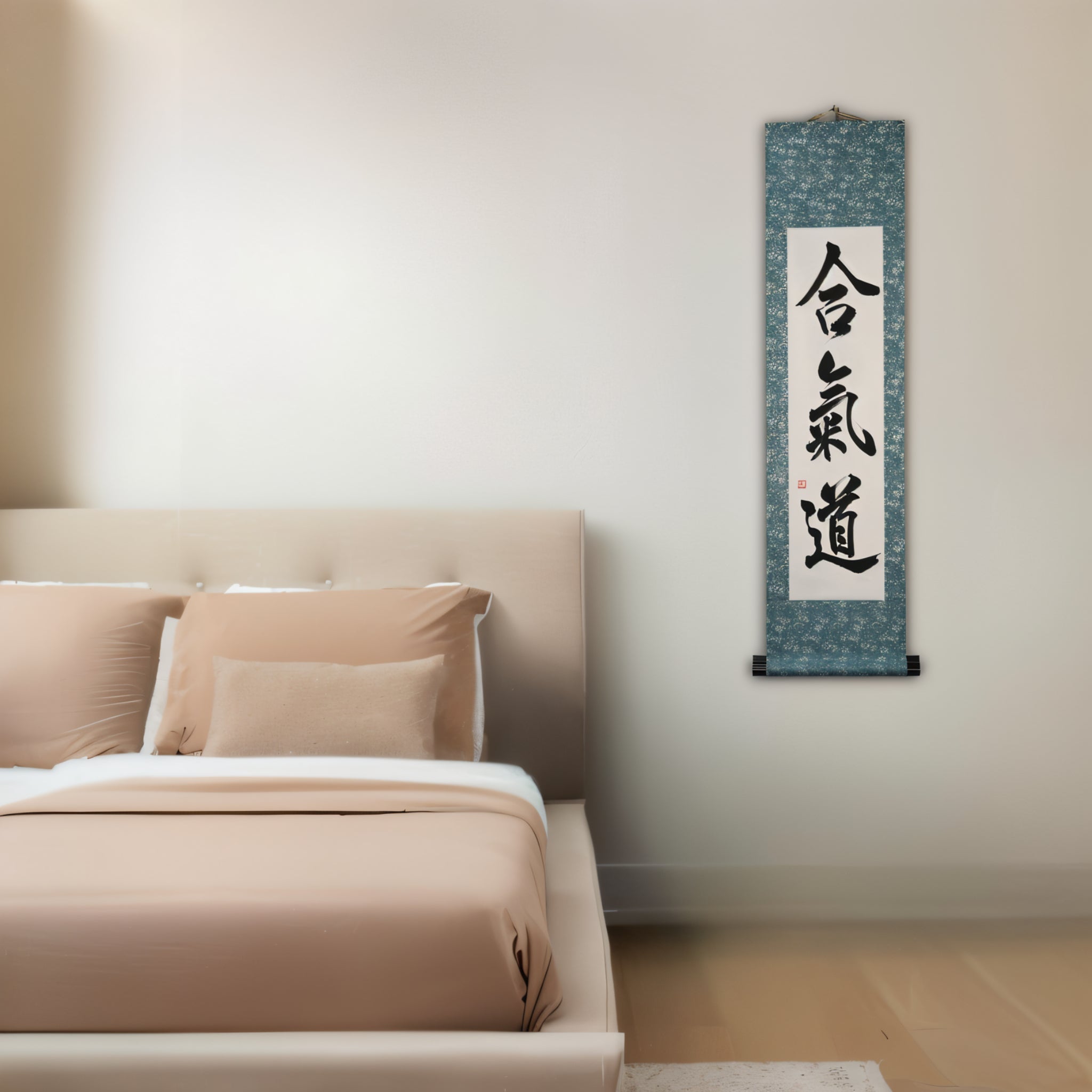 Este pergamino de caligrafía muestra con orgullo los tres caracteres de 合気道 (Aikido), que representan no solo el arte marcial, sino el compromiso y el camino que recorres en tu entrenamiento. No es solo una decoración, sino un símbolo de tu viaje, disciplina y el espíritu del Aikido.