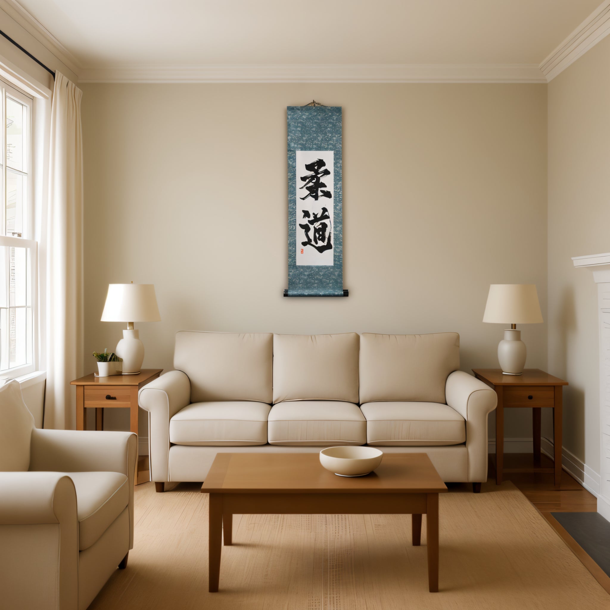 Este pergamino de caligrafía presenta los audaces caracteres 柔道 (Judo), una palabra que significa mucho más que solo un arte marcial. El Judo es tanto una disciplina como una filosofía — una manera de fortalecer el cuerpo, calmar la mente y desarrollar el carácter a través de la práctica.