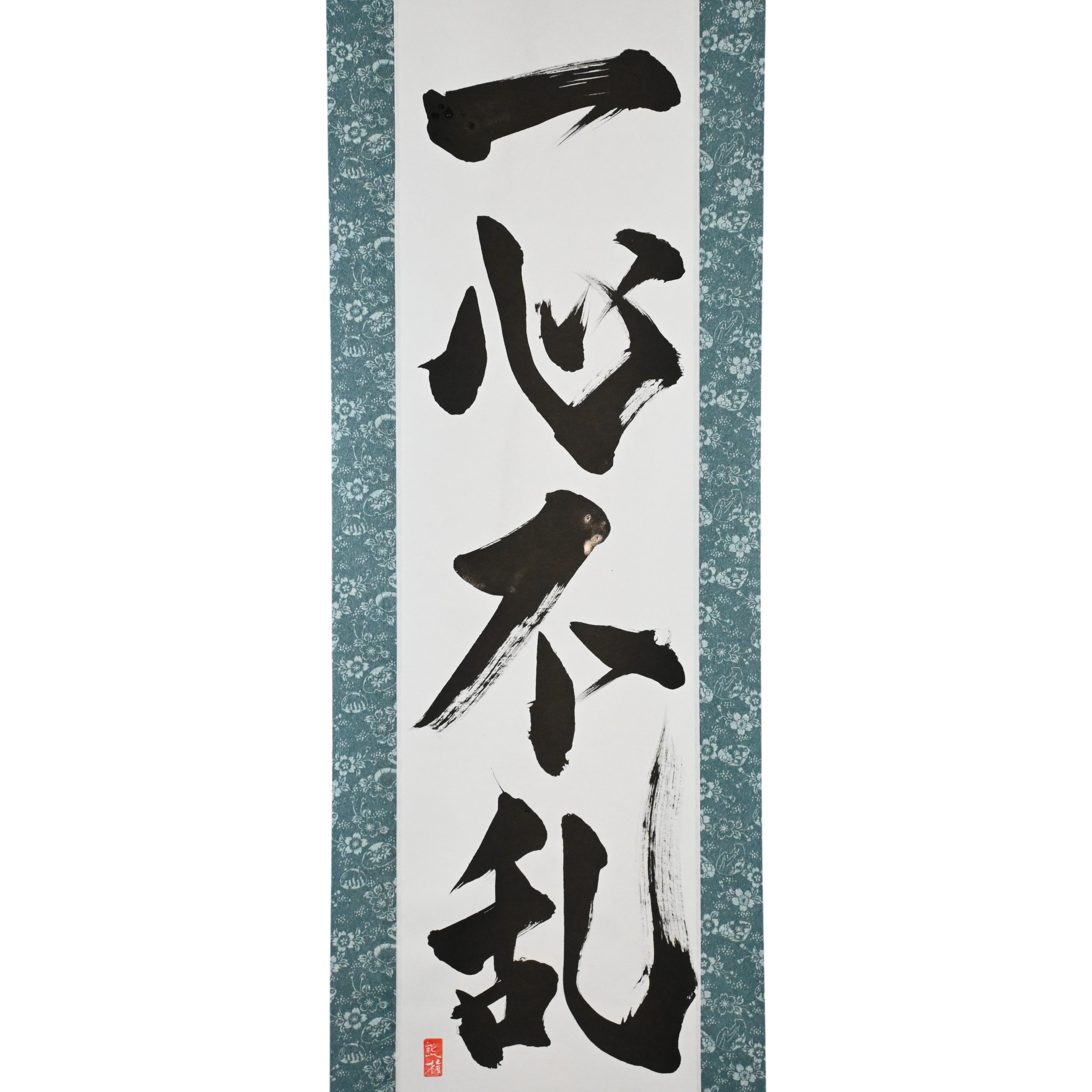 Este pergamino de caligrafía japonesa muestra la poderosa frase 一心不乱 (Isshin Furan), que significa “foco indiviso” o “con devoción absoluta”. Captura la mentalidad esencial de las artes marciales: la capacidad de eliminar distracciones y comprometerse por completo con el momento.