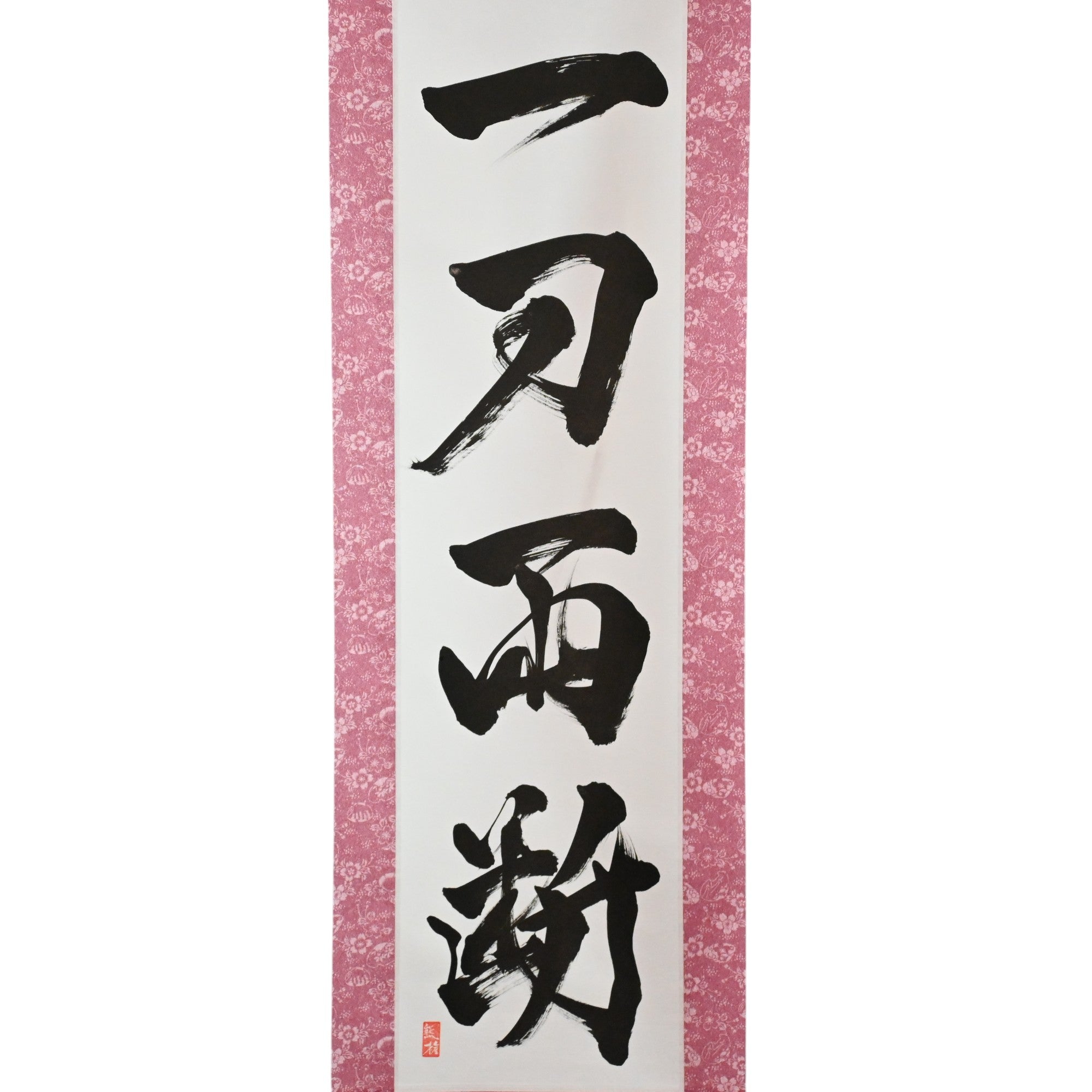 Este pergamino de caligrafía japonesa muestra audazmente la frase 一刀両断 (Ittō Ryōdan) — una expresión poderosa que captura la decisividad y claridad inquebrantables del espíritu samurái.