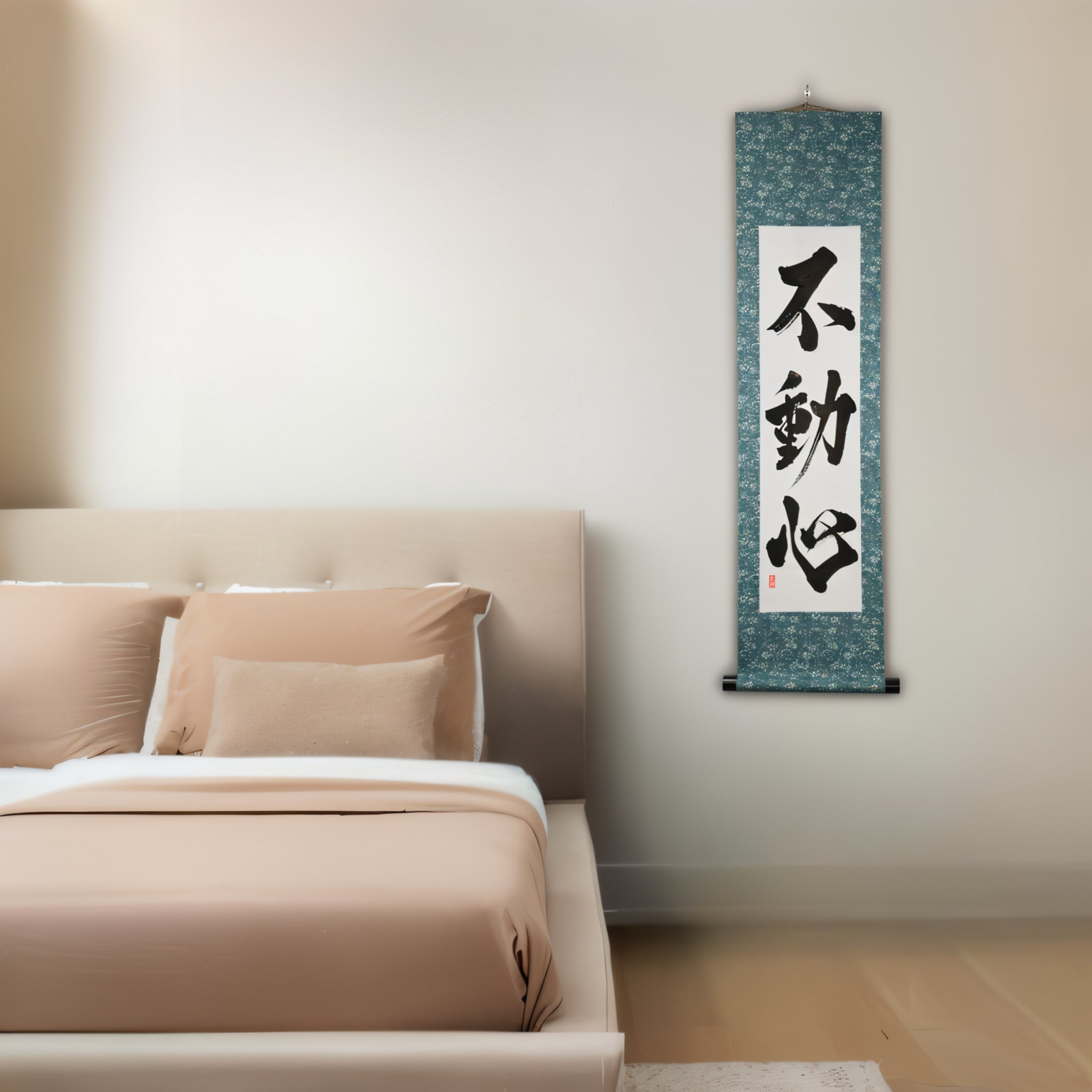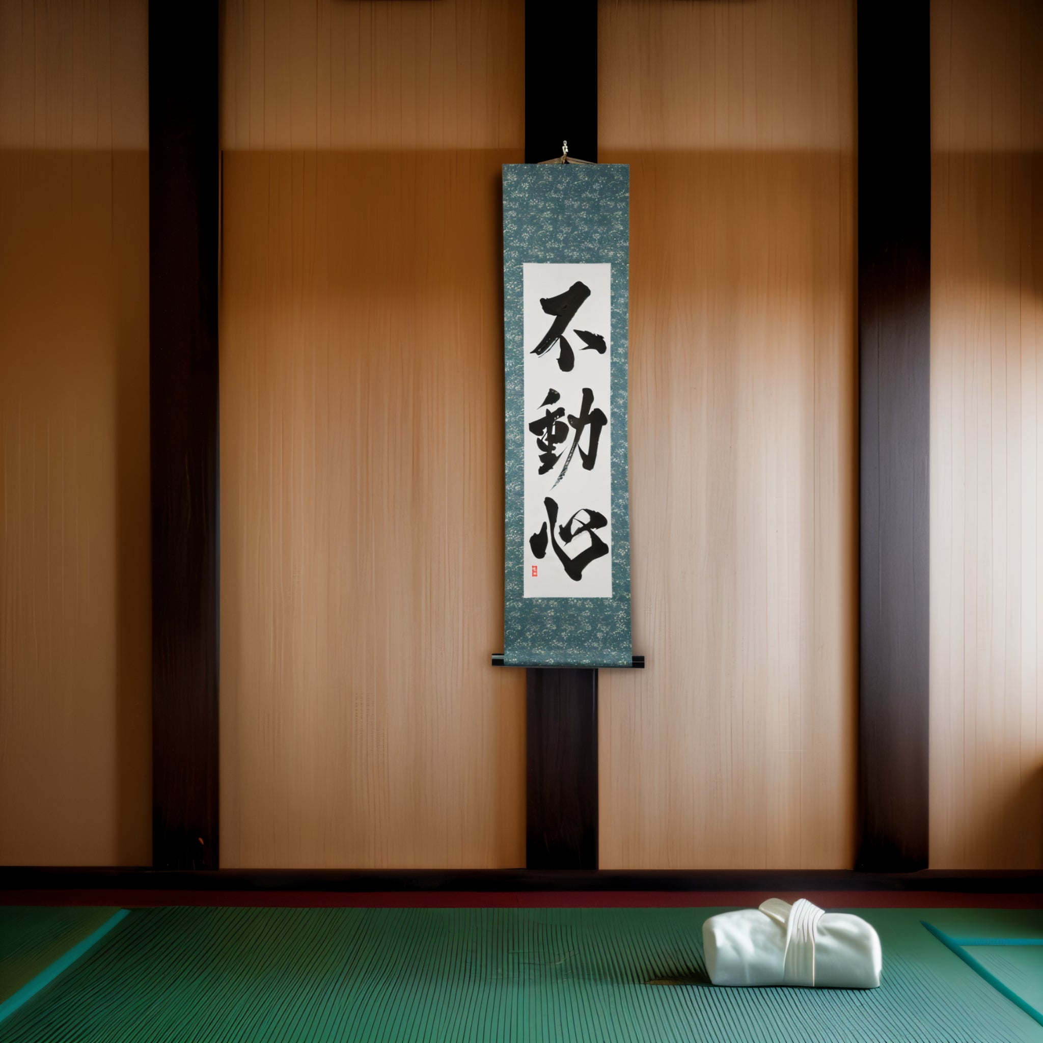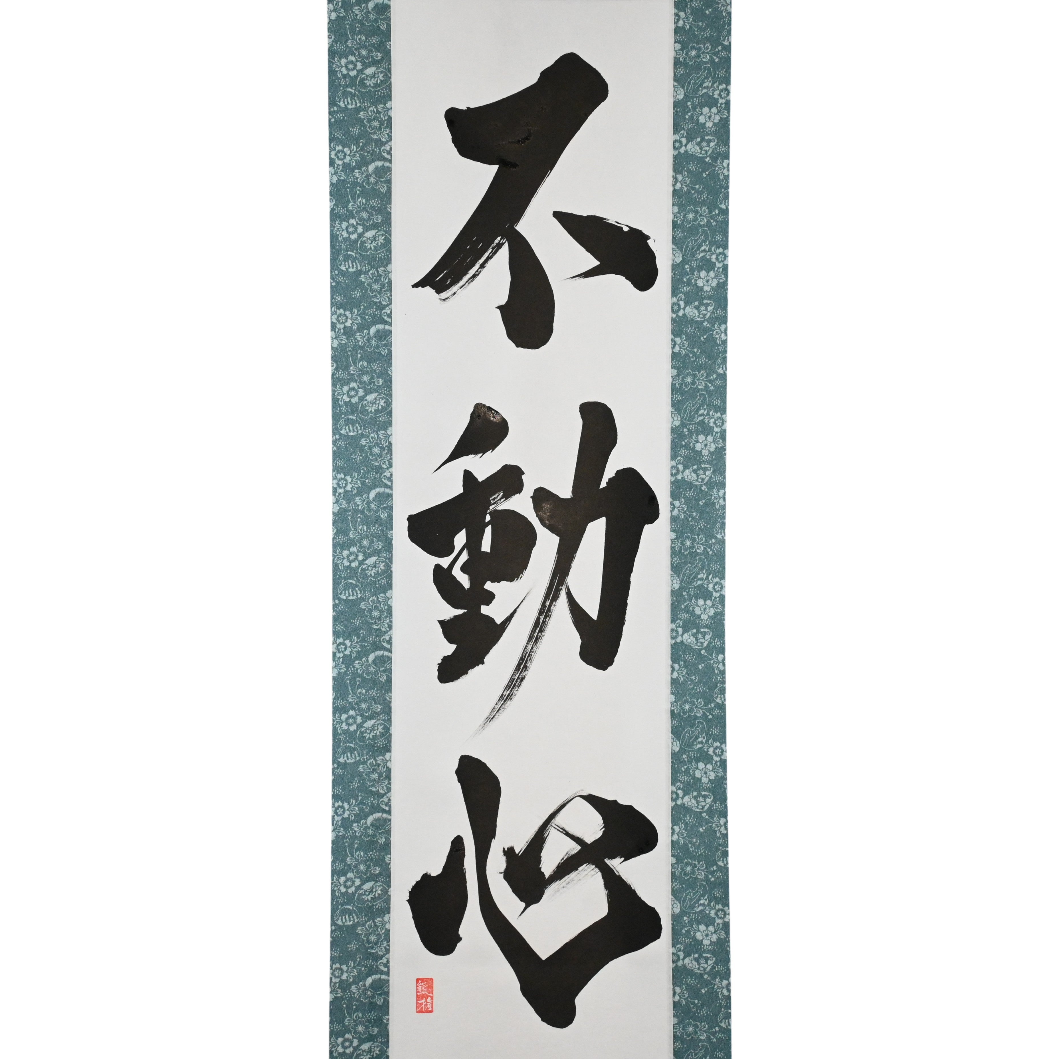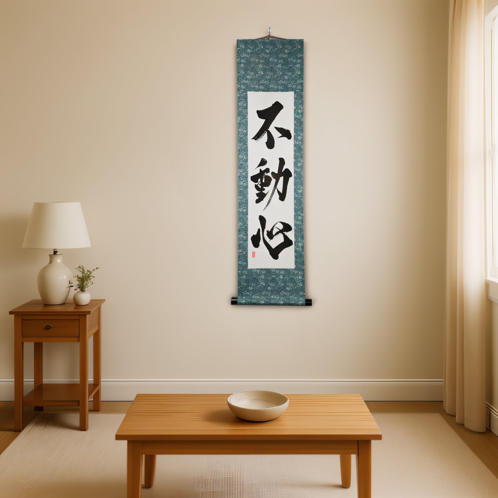 Este pergamino de caligrafía presenta el profundo concepto de 不動心 (Fudōshin) — "la mente inamovible". Representa un estado de calma y centrado que permanece inalterable ante el miedo, la ira o la duda. En las artes marciales y el camino del Samurai, Fudōshin se considera esencial para la verdadera maestría.