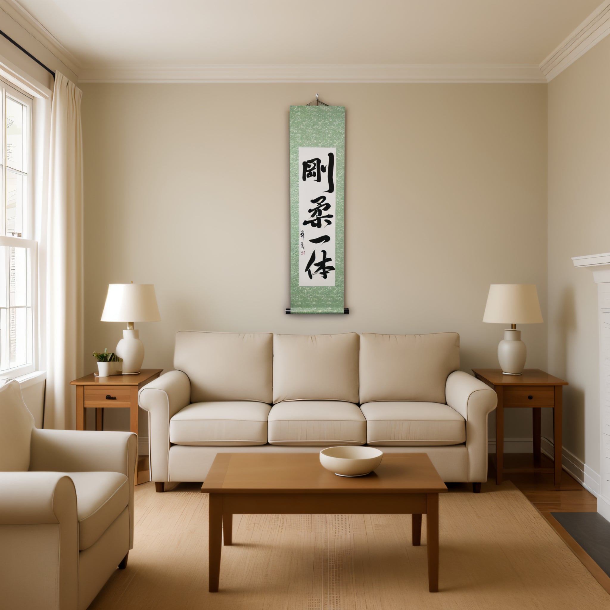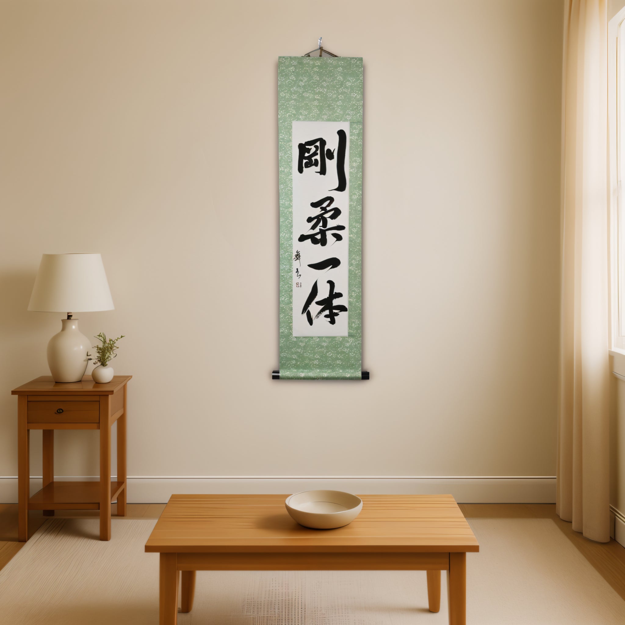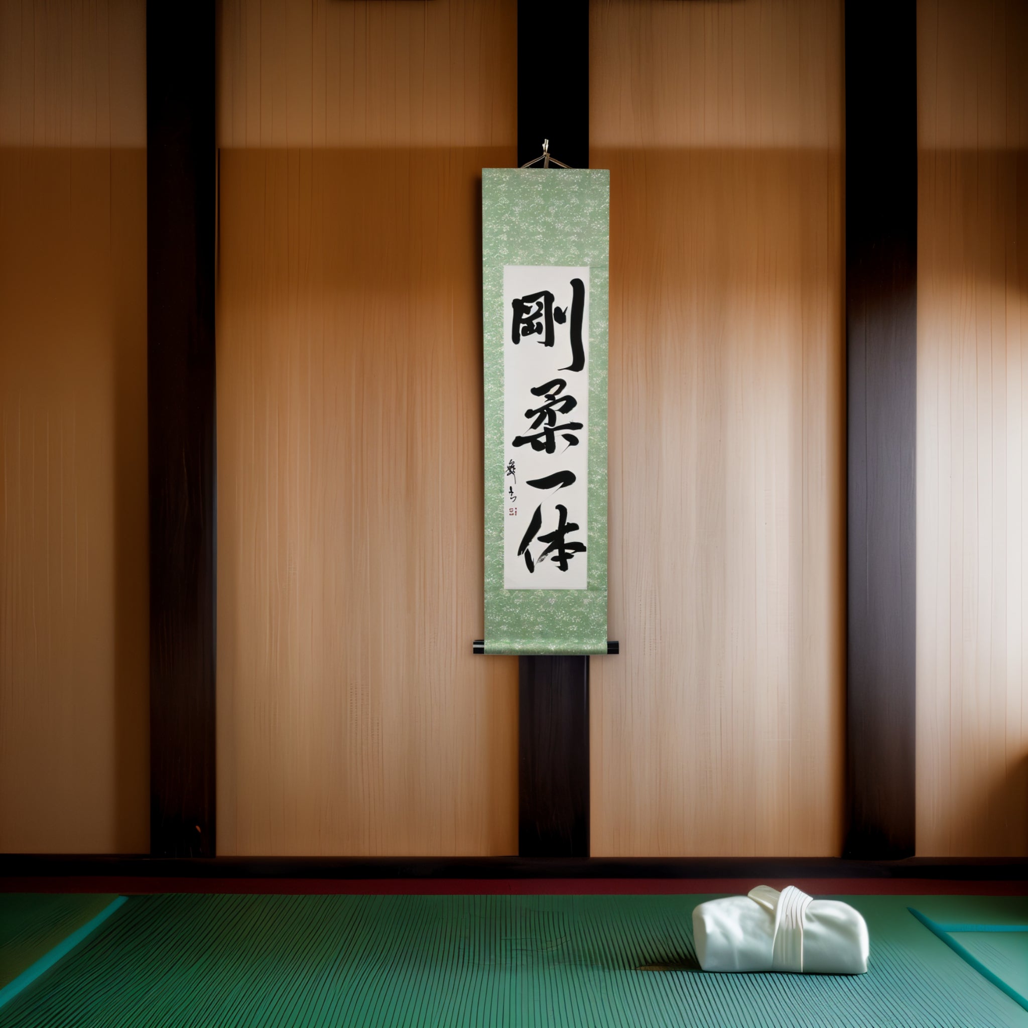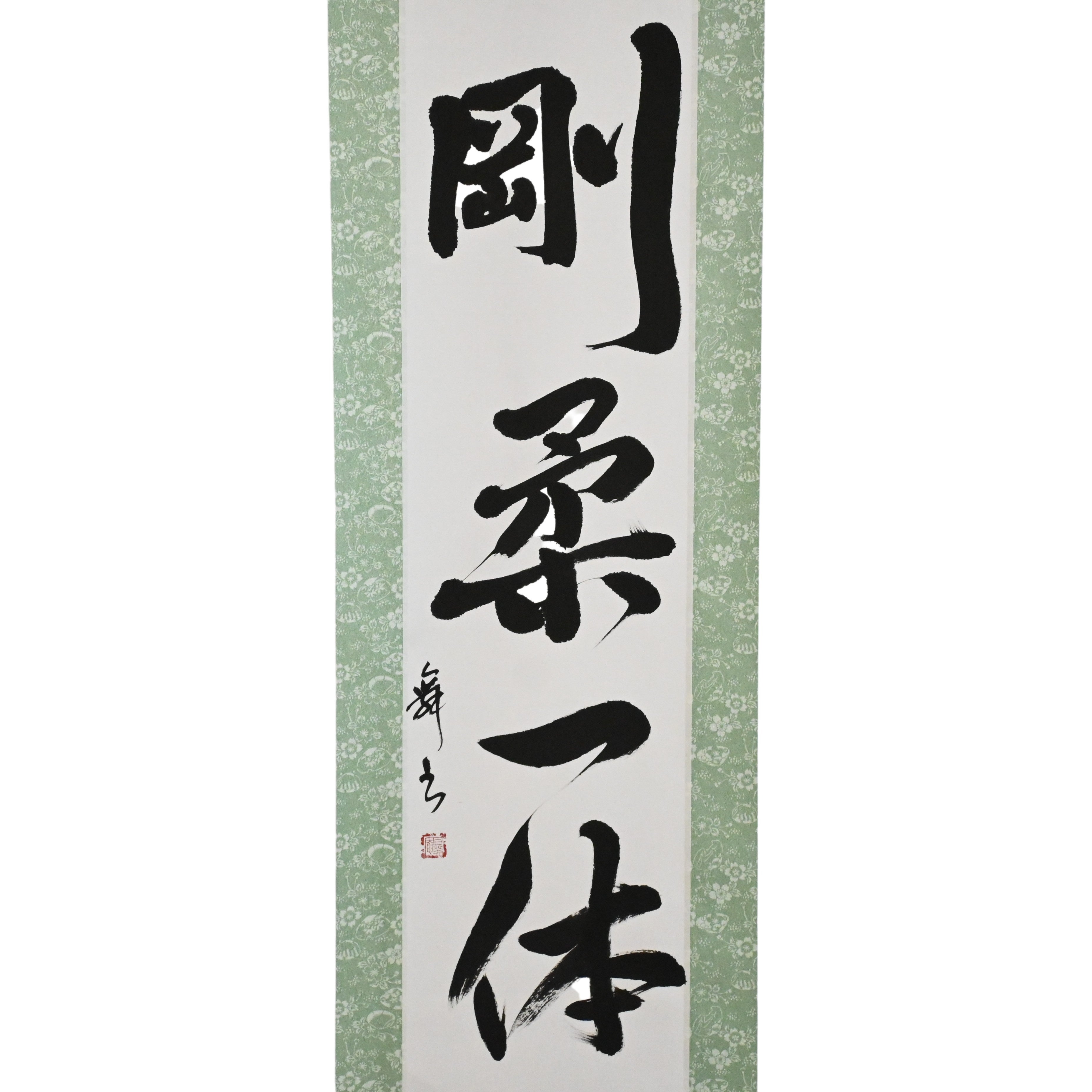 Este pergamino de caligrafía japonesa presenta la frase 剛柔一体 (Gōjū Ittai) — un concepto profundo que está en el corazón de la filosofía del Karate, especialmente en 剛柔流 (Gōjū-ryū), uno de sus estilos tradicionales más venerados.